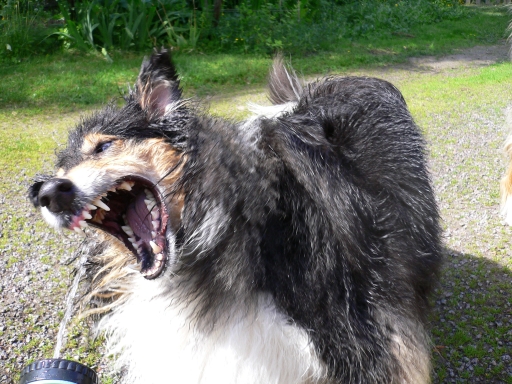 ピムは濡れないように逃げ回るだけ。リンミは大喜びです。