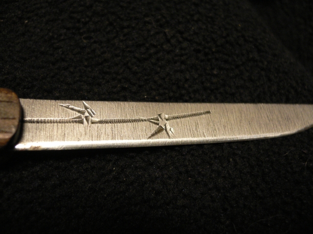 肥後守式の折りたたみで、柄は煤竹と黒檀。刃は、表がヤスリ目に竹をたがね彫り。裏は、のたれ波紋が出ています。