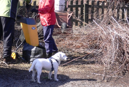 エイッカ君は短く切った枝が欲しくて、ウッドチッパーのそばから離れません。