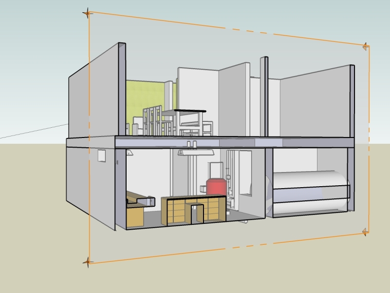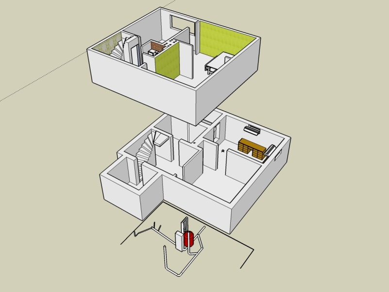家の分解図、地下室、一階と新しく入れた上・下水管。