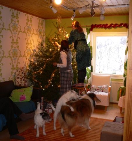 飾りつけは皆でやるのが伝統。犬はほかの事に夢中だけど気にしないようにσ(^_^;)アセアセ...
