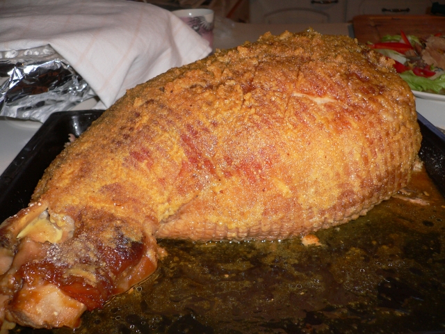 ↑フィンランドのクリスマス料理お約束の、豚の太もも丸焼きハム。
