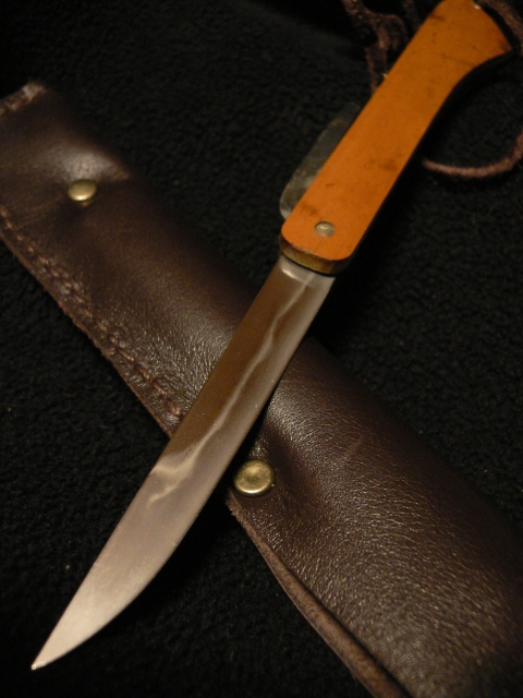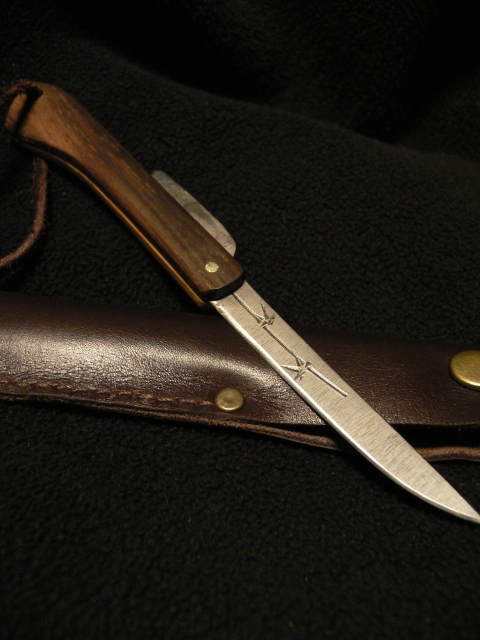 肥後守式の折りたたみで、柄は煤竹と黒檀。刃は、表がヤスリ目に竹をたがね彫り。裏は、のたれ波紋が出ています。